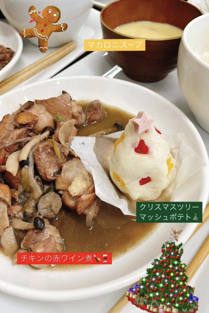 普段から「暖かくて美味しいものを」というコンセプトのもと、ランチはもちろんのこと、その日の体調や気分を盛り上げられる様なメニューを心掛けて提供しています。そして、クリスマスは普段よりも更に特別なものをご用意させていただき、少しでも利用者さんに喜んでいただけるように、特別感を大切にしました。食事を通じて、みんなが楽しめる時間を作り出せれば良いと思いました。