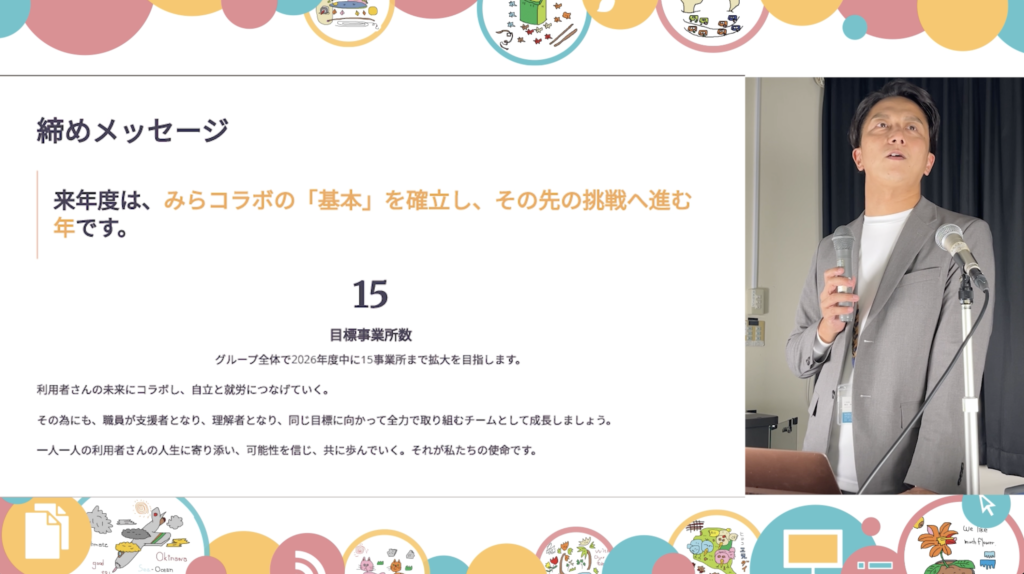 制度や環境の変化、利用者ニーズの多様化、支援事業所に求められる役割の広がり。みらコラボがどういった役割を担い、どこを目指しているのかも含めて熱心に語ってくれました。