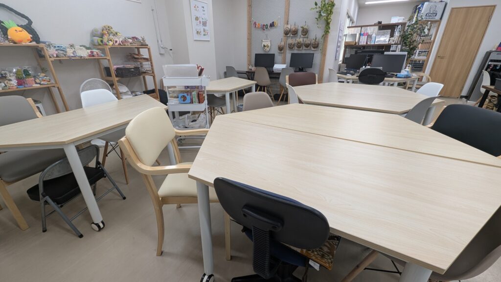 国場事業所は、スタッフと利用者さんの距離が近く、温かくアットホームな雰囲気が特徴です。安心して通える場所でありながら、「新しいことに挑戦できる場所」であることを大切にしています。友利さんは長田店でも活動しているため毎日が大忙しです!!
